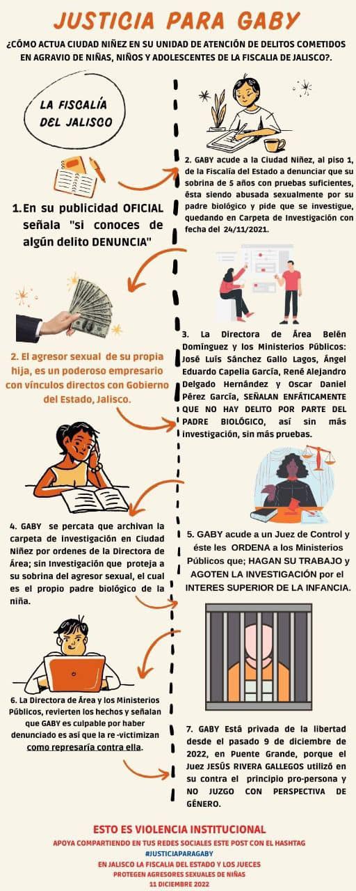 Gabriela es una mujer que fue a la Fiscalía de Jalisco para denunciar un abuso sexual en contra de su sobrina. Las autoridades le pidieron pruebas del abuso, por lo que Gaby tomó fotos y videos del cuerpo de la menor como pruebas.