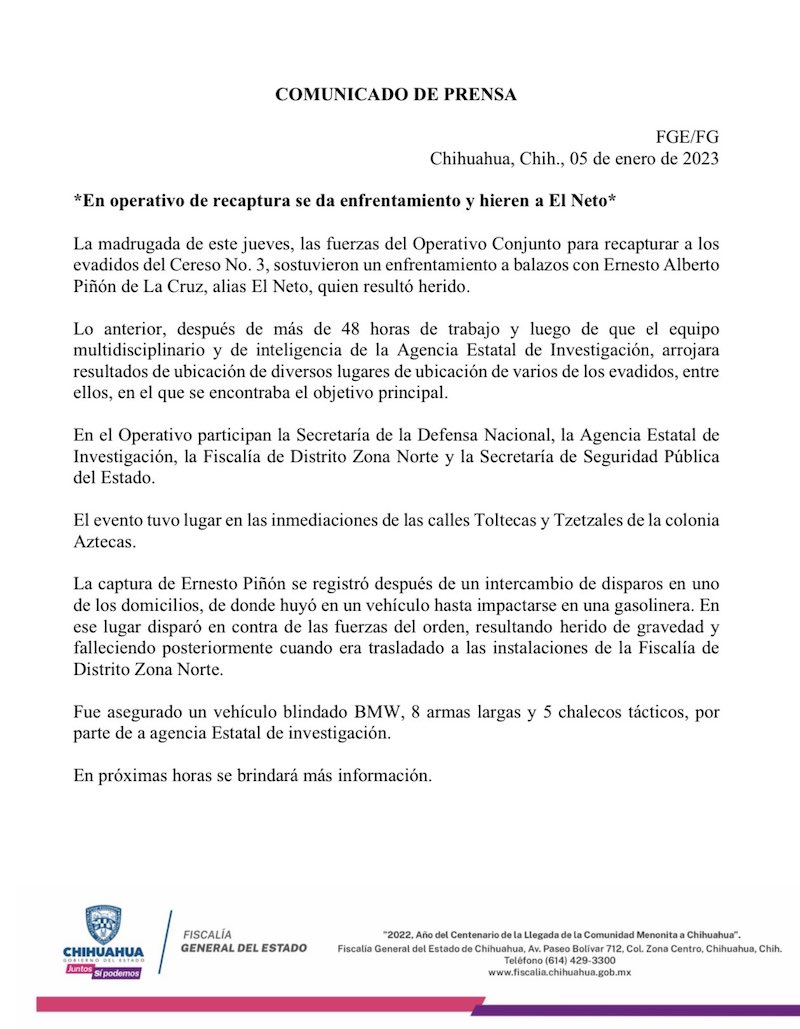“La captura de Ernesto Piñón se registró después de un intercambio de disparos en uno de los domicilios, de donde huyó en un vehículo hasta impactarse en una gasolinera. En ese lugar disparó en contra de las fuerzas del orden, resultando herido de gravedad y falleciendo posteriormente cuando era trasladado a las instalaciones de la Fiscalía de Distrito Zona Norte”.