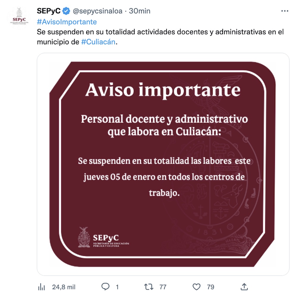 En cuanto a las clases, la SEPyC de inmediato informó sobre la suspensión en su totalidad de las actividades docentes y administrativas en el municipio de Culiacán.