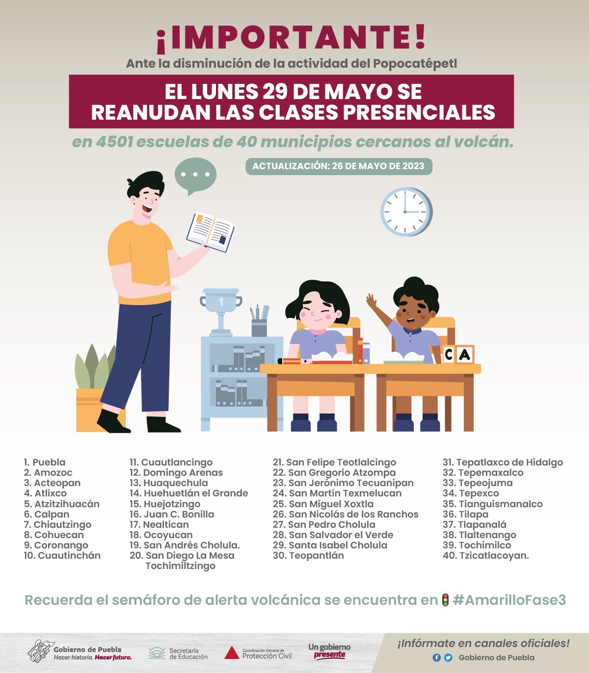 En su cuenta de Twitter, el gobernador Sergio Salomón explicó que ante la disminución de la actividad del Popocatépetl, se determinó que regresarán las clases presenciales para 40 municipios cercanos al volcán a partir del próximo lunes 29 de mayo.