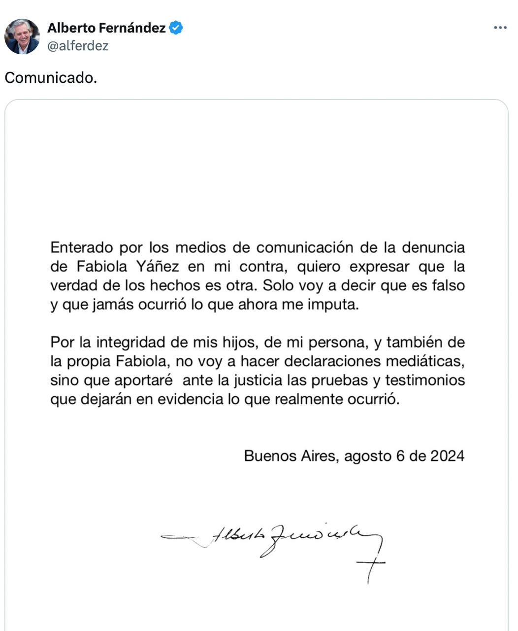 Por medio de un comunicado publicado en redes sociales, Alberto Fernández afirmó que la “verdad sobre los hechos es otra”, que las acusaciones son falsas y que jamás ocurrió lo que ahora le imputan.