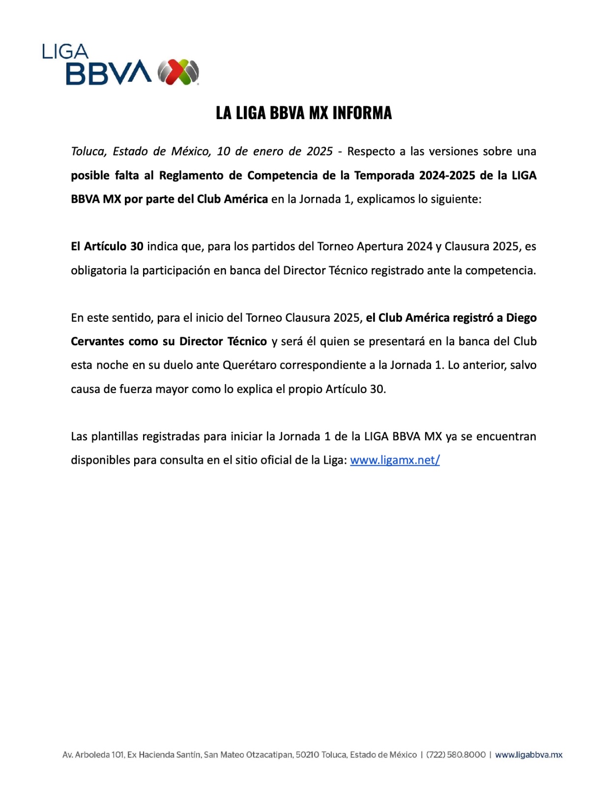 La Liga MX informó en un comunicado que si bien el reglamento es claro, América registró oportunamente a Diego Cervantes como su DT para la Jornada 1 contra Querétaro. Es decir, la ausencia de Jardine no representa una violación al reglamento. De hecho, en la ficha oficial del partido aparece Cervantes como DT de las Águilas.