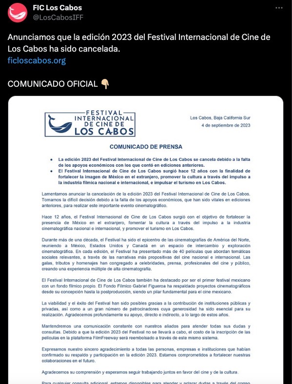 “Tomamos la difícil decisión debido a la falta de los apoyos económicos, que han sido vitales en ediciones anteriores, para realizar este importante evento cinematográfico”, se lee el comunicado de FICLosCabos.