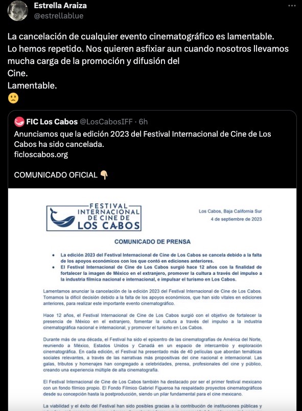 “Lo hemos repetido. Nos quieren asfixiar aun cuando nosotros llevamos mucha carga de la promoción y difusión del cine“, agregó Araiza en su tuit tras la publicación del comunicado sobre la cancelación del Festival de Cine de Los Cabos 2023.