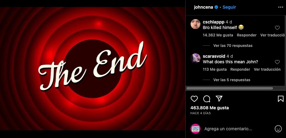 El propio John Cena posteó en Instagram una imagen con la frase “The End”, ilustrada con el clásico logo circular rojizo de los Looney Tunes (aunque algunos especularon que la imagen podría referirse al final de la huelga de actores).