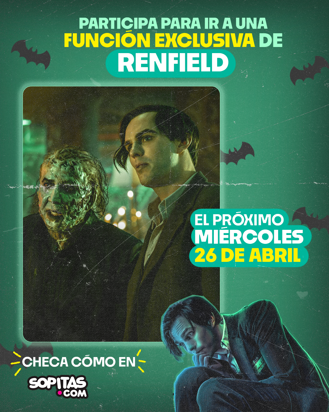 ¡Así es! Tendremos una función exclusiva para Sopitas.com de Renfield. La cita es el miércoles 26 de abril a las 8 pm en Cinemex Patriotismo. Para ganarte unos pases sólo debes realizar la siguiente dinámica (que, te prometemos, está muy simple).