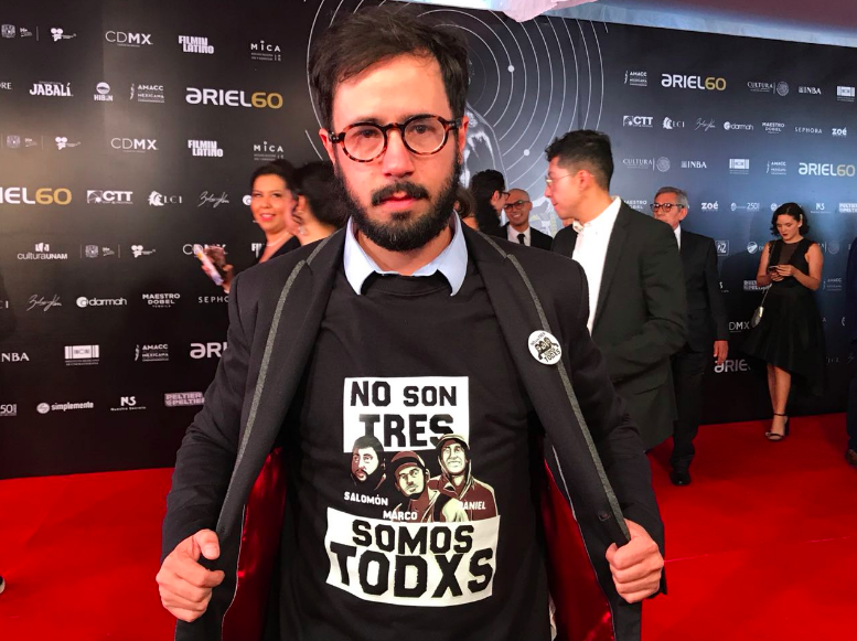 La edición número 60 de los Premios Ariel tuvo lugar este 5 de junio en el Palacio de Bellas Artes. Por la alfombra roja desfilaron varias personalidades del mundo del espectáculo como Andrés Almeida, Martín Hernández, Emiliano Zurita, Ilse Salas, Fátima Molina, Claudia Ramírez, pero sin duda lo que más llamó la atención fue la llegada de los creadores de Chambelán, un cortometraje producido por el CUEC de la UNAM y dirigido por Fabián León, quienes sostuvieron un cartel con la insignia ¡Somos Todxs! en honor a los estudiantes fallecidos en Jalisco.