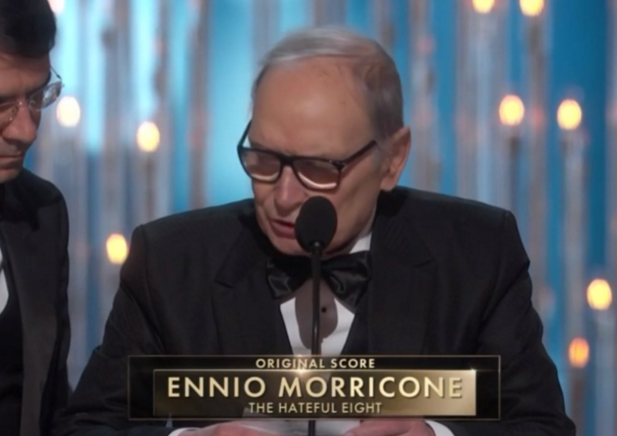 22:23 – Ennio Morricone gana el primer Oscar de su carrera en la categoría Mejor Música Original, por The Hateful Eight.