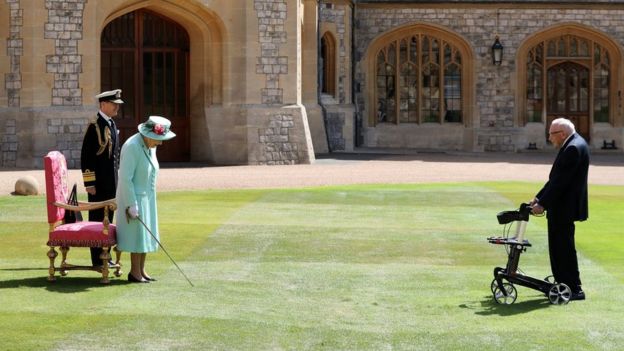 La Reina de Inglaterra elogió personalmente a Tom Moore y le dijo: “Muchas gracias, una increíble cantidad de dinero que recaudó”. Increíble de hecho… Originalmente Tom esperaba recaudar mil libras, pero al final recaudó más de 32 mil 500 libras y más de un millón y medio de seguidores.