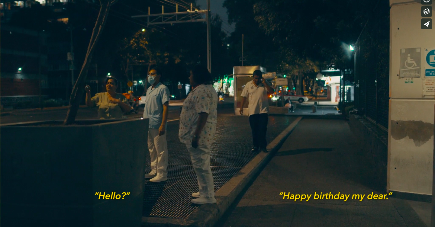 Y al mismo tiempo, se escuchan las llamadas del personal médico a sus familiares en pláticas que son todo menos casuales por más que las preguntas lo sean. Le cantan las mañanitas a alguien, le preguntan cuándo termina el turno a otro, y alguien diciendo que ya no quiere ver más pacientes en terapia intensiva.