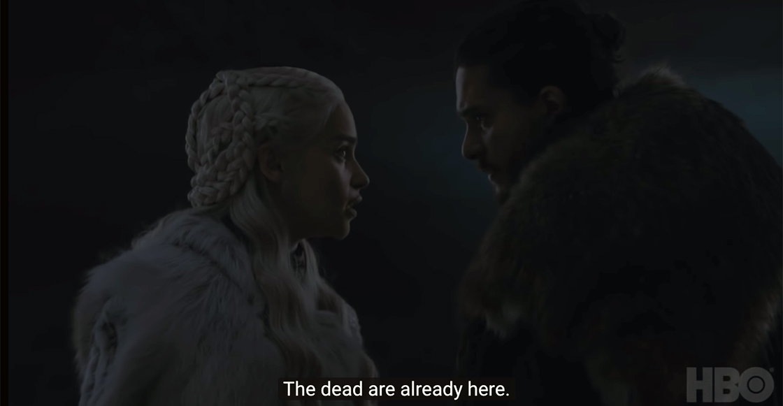 Esto coincide con lo que Daenerys le dice a Jon durante la guerra en el preview del tercer episodio de la octava temporada de Game of Thrones: “Los muertos ya están aquí”. También aparece Arya corriendo entre las criptas muy, muy asustada (lo cual es algo difícil de ver en ella). Y aunque esto ya lo habíamos visto en el tráiler promocional de la última temporada de la serie, ahora toma otro significado si se trata de ver a su padre o tía o a alguno de los Stark vuelto un zombie y tratando de destruir a cualquier hombre o mujer vivo.