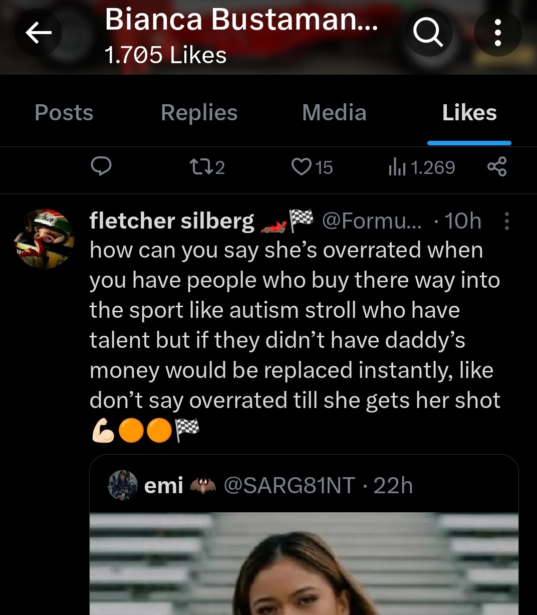 Y es que varios de sus seguidores se dieron cuenta que entre los ‘Me gusta’ de Bianca había varios contra Lance Stroll y todos coincidían en que a diferencia de Stroll, Bianca se había ganado su lugar por mérito propio y no por ayuda de su padre, aunque resaltó uno que tachaba como autista al piloto de Aston Martin.