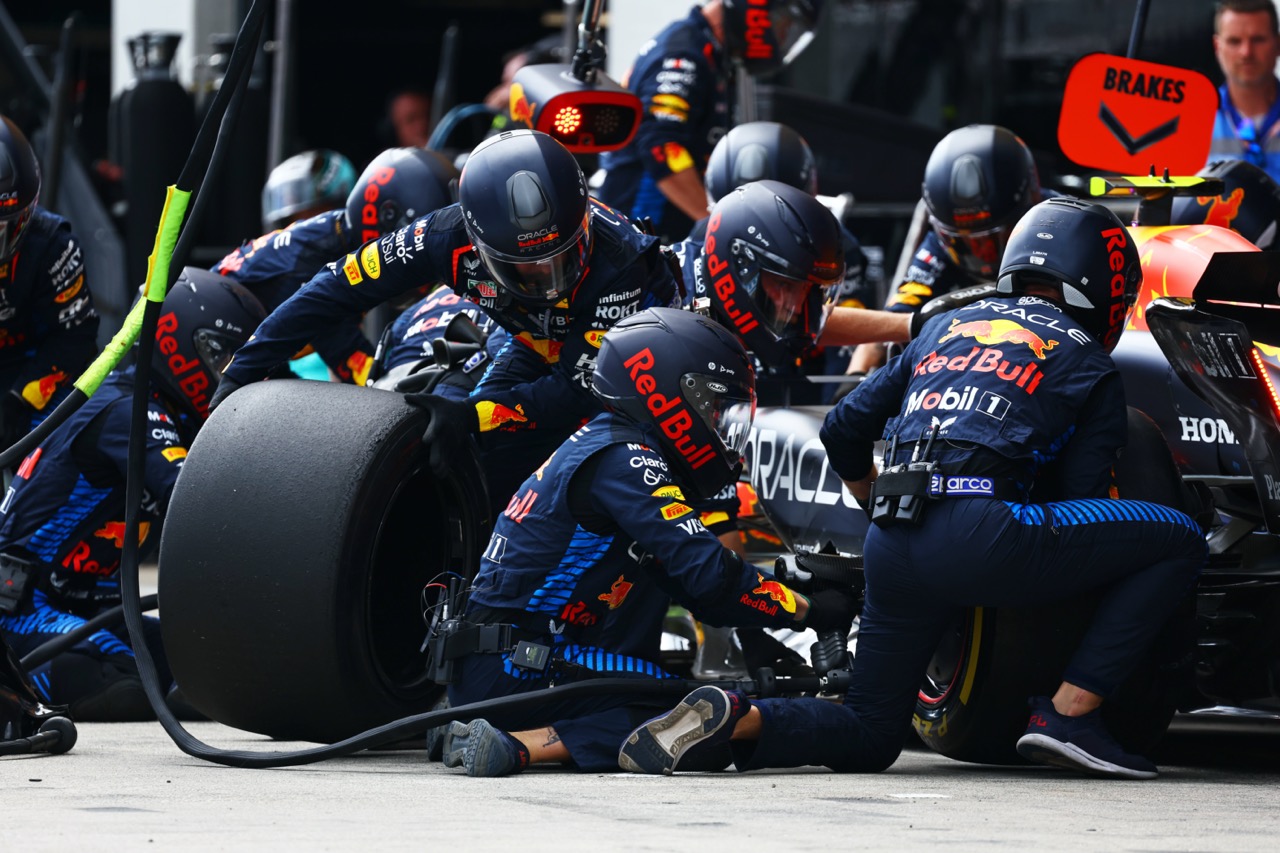 La estrategia de Red Bull para Checo fue prácticamente la misma que con Max. Ambos salieron con medios, cambiaron a duros y regresaron al medio para el final de la carrera. Aunque Verstappen tuvo que hacer una parada extra tras el incidente con Lando Norris y terminó con neumáticos blandos.