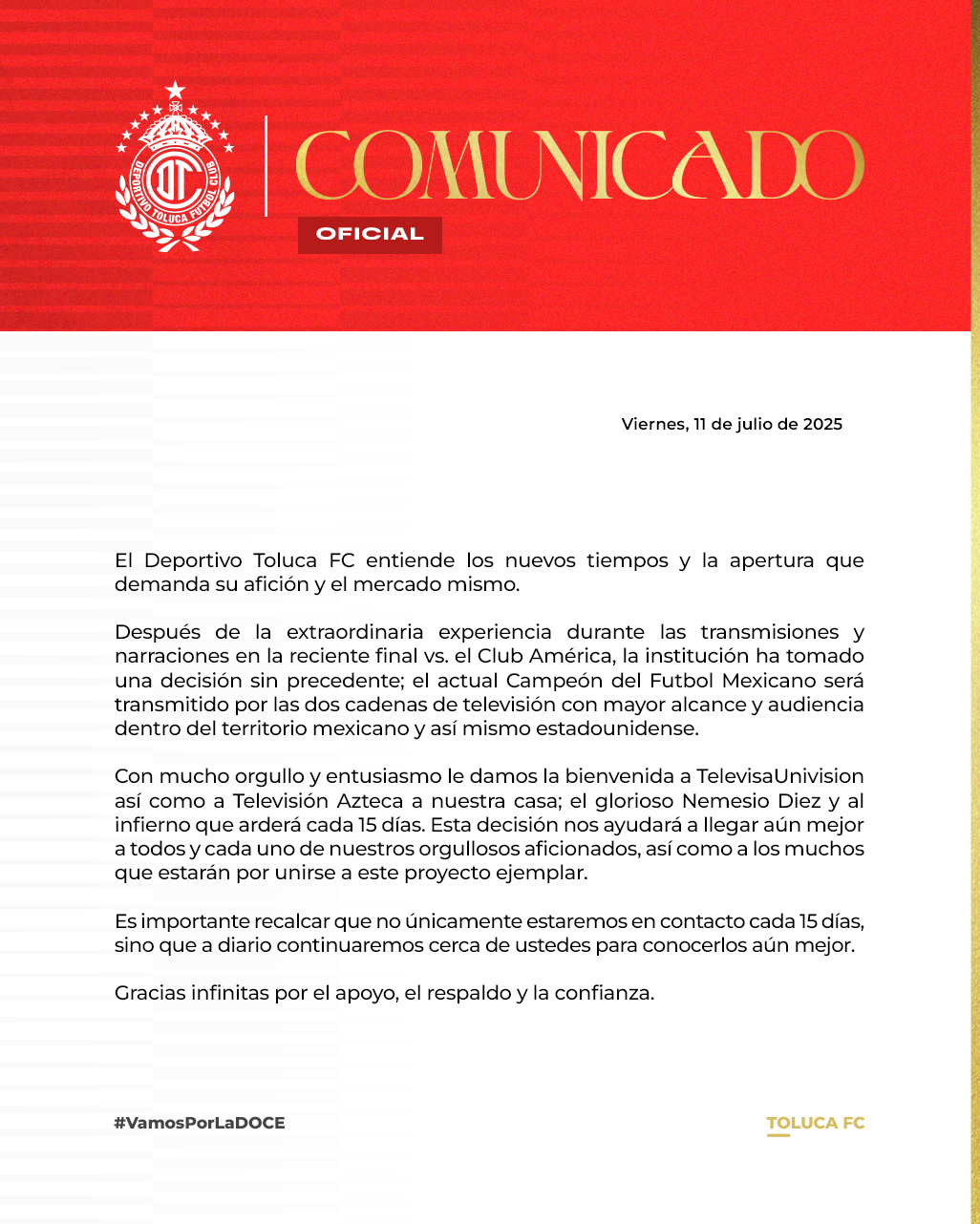 Los partidos de Toluca, actual campeón de la Liga, serán transmitidos por Televisa y TV Azteca.