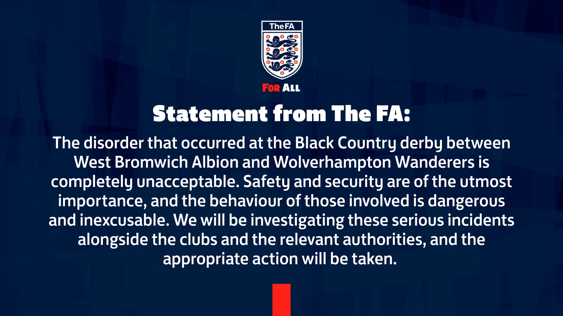 “El desorden ocurrido en el derbi del Black Country entre West Bromwich Albion y Wolverhampton Wanderers es completamente inaceptable. La seguridad y la protección son de suma importancia y el comportamiento de los involucrados es peligroso e imperdonable. Investigaremos estos graves incidentes junto con los clubes y las autoridades pertinentes y se tomarán las medidas adecuadas“
