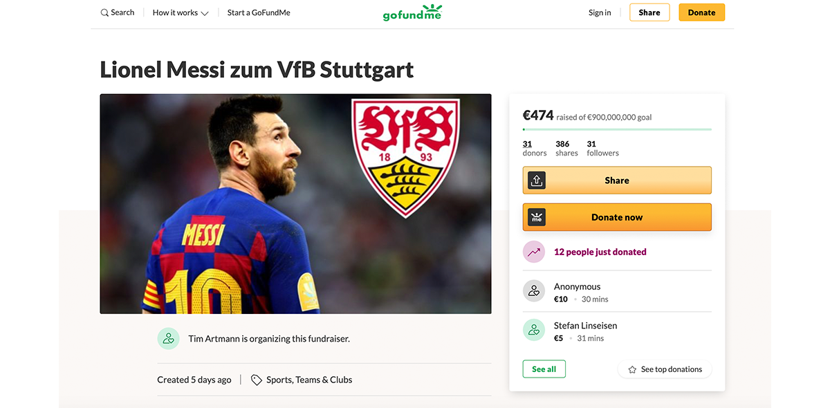 A través de la plataforma GoFundMe, los fans del Stuttgart han puesto en marcha la campaña para recaudar 900 millones de euros. O sea que planean hasta negociar por si Messi termina costando más de los 700 ya mencionados.