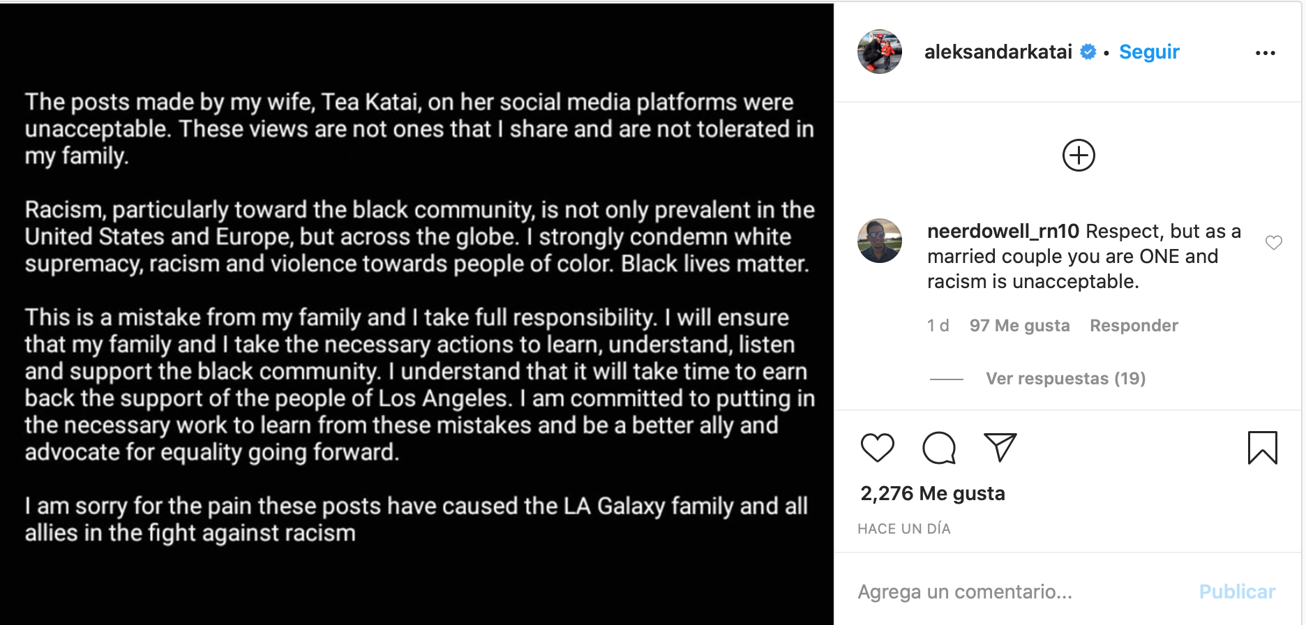 Las publicaciones obviamente fueron borradas minutos después pero el daño ya estaba hecho. Aleksandar Katai posteriormente publicó un comunicado en sus redes sociales, en donde aseguró que esas actitudes no son toleradas en su familia.