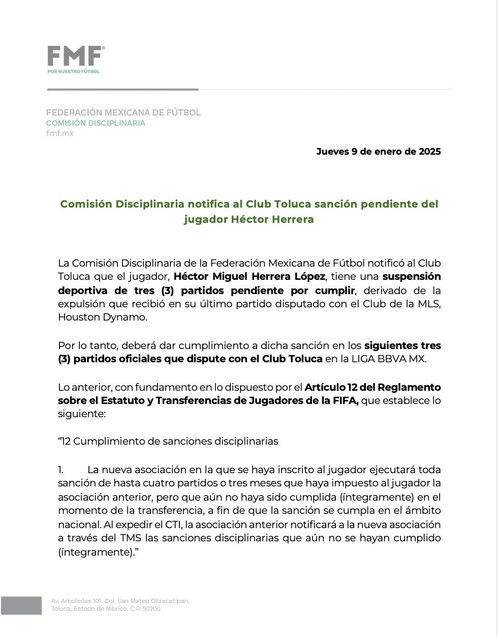 “Héctor Miguel Herrera López tiene una sanción de tres partidos pendiente por cumplir (…) Por lo tanto, deberá dar cumplimiento a dicha sanción en los siguientes tres partidos que dispute el Club Toluca en la Liga MX“, explicaron en un comunicado.