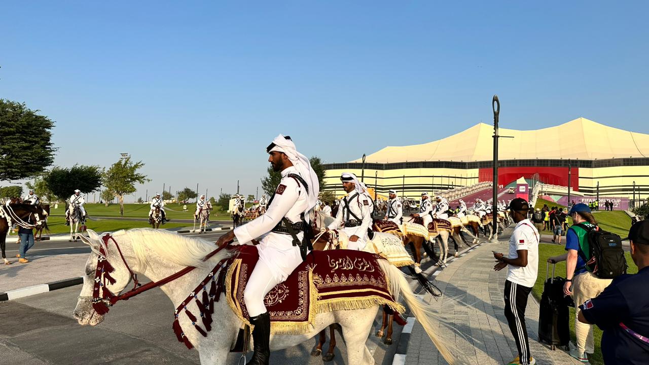 Llegamos al estadio unas tres horas antes de comenzar el partido inaugural y en la entrada a estadio Al Bayt nos encontramos a la guardia qatarí. Aquí los elementos de resguardan la seguridad no van caballo como en muchos otros países y poco llevan perros, sino camellos.