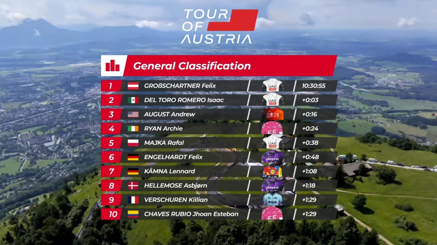 Felix Grobschartner lídera la clasificación con 10:30:55, mientras que, Isaac lo sigue con 10:30:58. En la tercera posición marcha Andrew August con 10:31:11. Pero ya sabemos que nada esta escrito en el ciclismo y todo podría cambiar en las etapas restantes.
