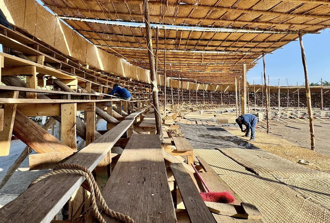 Las gradas de madera, divididas en 70 tablados o secciones, están levantadas en un área de dos mil metros cuadrados, que permiten un cupo aproximado de 6 mil 400 espectadores.