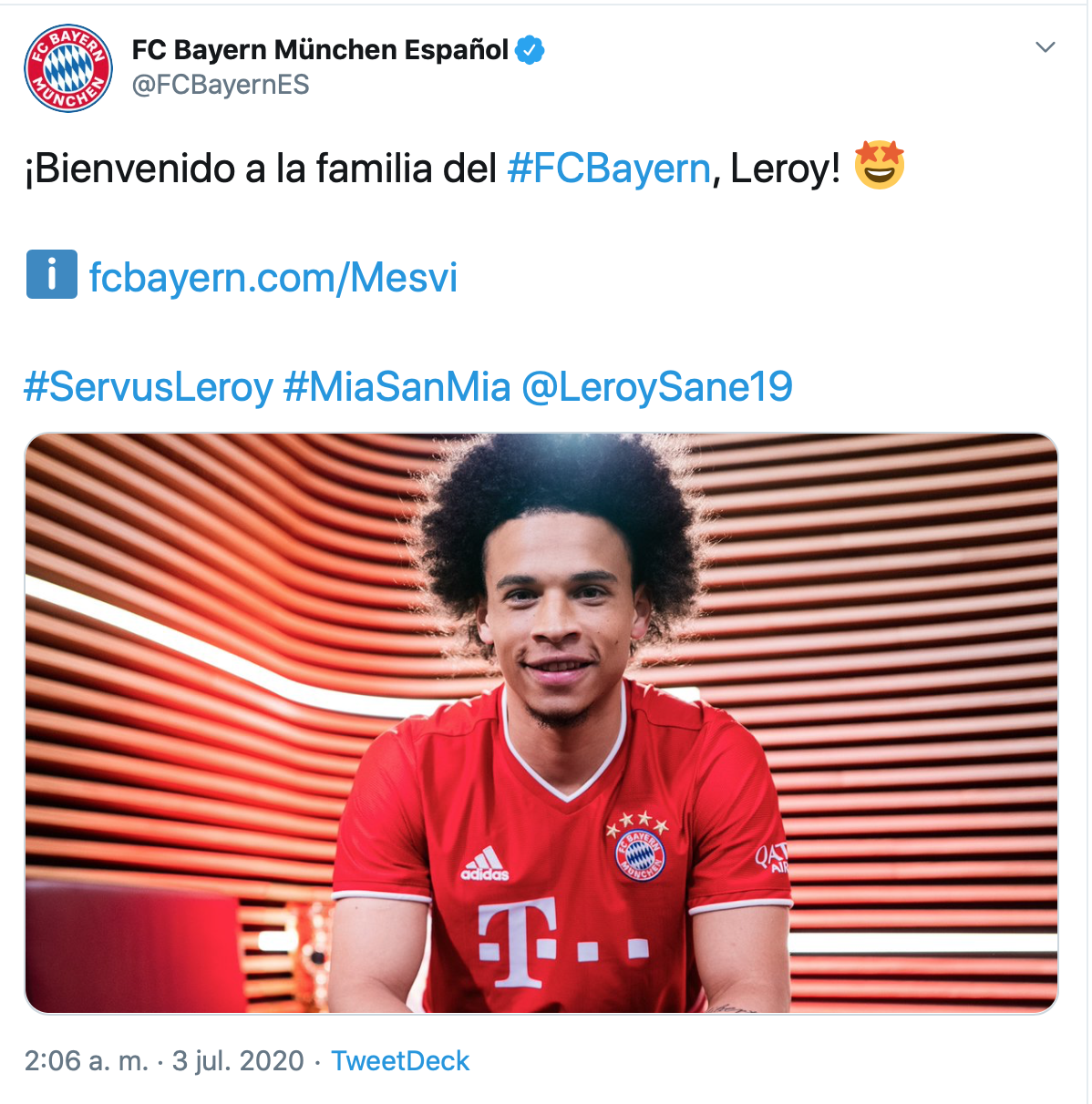 El extremo alemán, Leroy Sané, seguirá su carrera en el Bayern Múnich. Los bávaros anunciaron la llegada del jugador, procedente del Manchester City en un fichaje que se había retrasado por una lesión del futbolista.