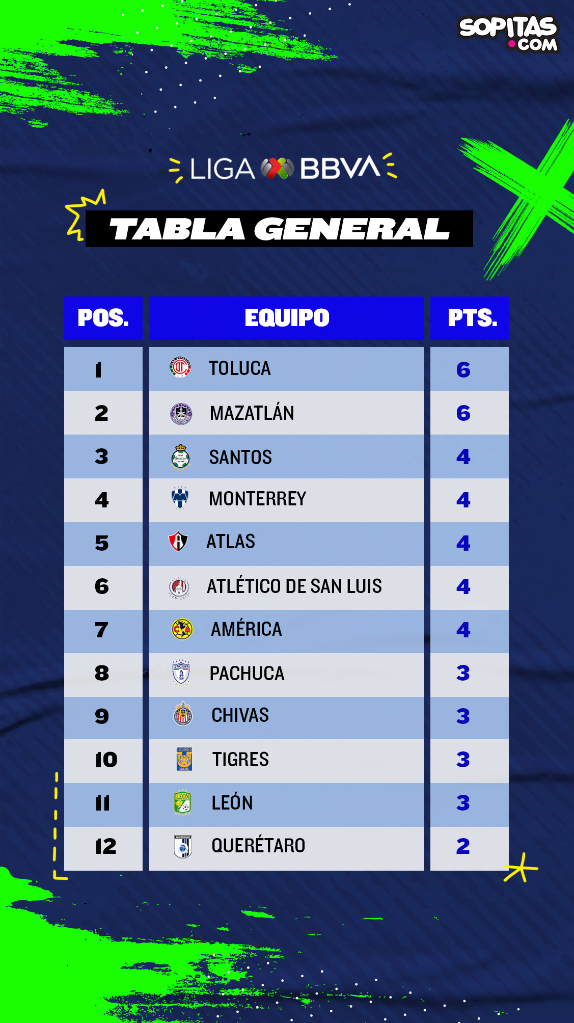 Que Toluca y Mazatlán le tomen una foto a la tabla general en estos momentos, pues comparten el liderato después de dos jornadas. Tanto el equipo mexiquense como el sinaloense han ganado sus dos primeros partidos y el ‘Chorizo Power’ es el equipo con más pólvora, después de hacerle tres a Tigres y tres a Juárez en la primera jornada.