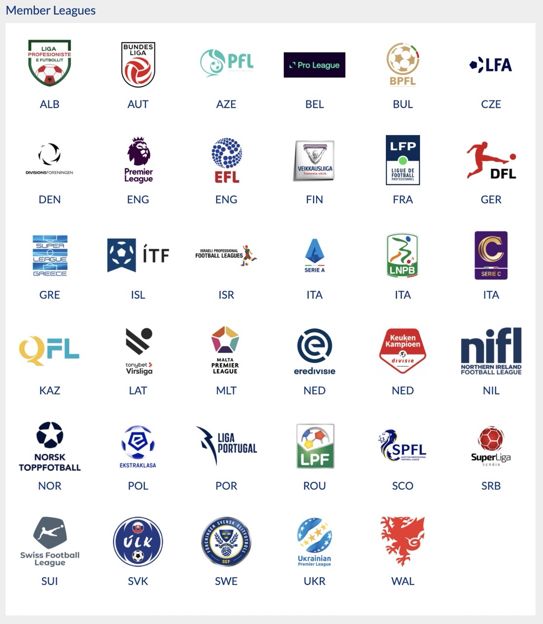 39 ligas profesionales de toda Europa son miembro de la Asociación de Ligas Europeas, incluyendo la Premier League, la English Football League, las diferentes ligas de Alemania, la Serie A, B y C de Italia, Ligue 1 de Francia, Eredivisie de Países Bajos y la Liga de Portugal.