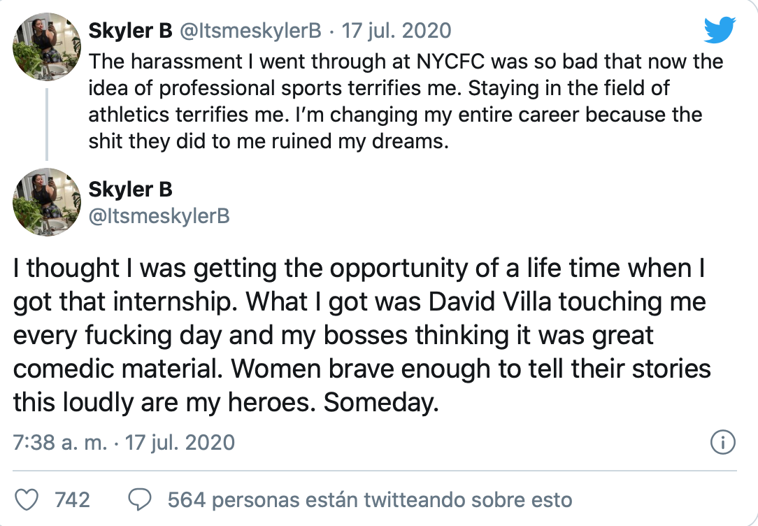 “El acoso que pasé en el NYCFC fue tan malo que ahora me aterra la idea de los deportes profesionales. Lo que me hicieron ha arruinado mis sueños. Pensé que estaba teniendo la oportunidad de mi vida cuando conseguí esas prácticas. Lo que tuve fue a David Villa tocándome cada día y mis jefes considerándolo un gran material humorístico“, comenzó.