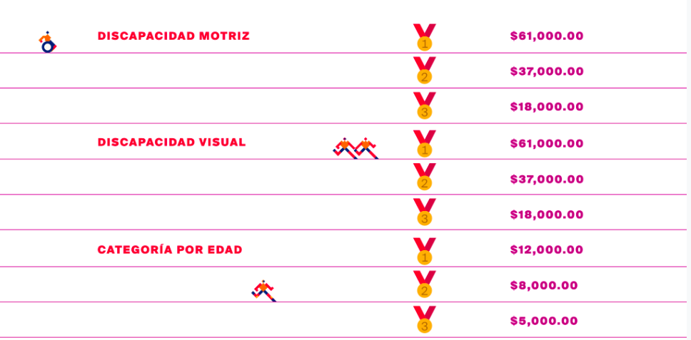 En cuanto a la persona con discapacidad motriz (los que compiten en sillas ruedas o con muletas) que cruce la meta en primer lugar obtendrá, mientras que aquel que cruce la meta con discapacidad visual tendrá otros 61 mil pesotes.