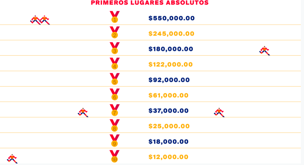 El ganador absoluto se embolsará 550 mil pesos (más de medio millón), mientras que el segundo obtendrá 245 mil y el tercero 180 mil. El décimo se podrá ir con 12 mil pesos.