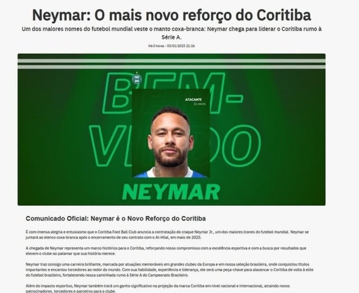 “Con inmensa alegaría y entusiasmo el Curitiba FC anuncia la contratación de Neymar Jr., uno de los mayores iconos del futbol mundial. Neymar se unirá al equipo una vez que haya terminado su contrato con el Al-Hilal, en mayo del 2025″