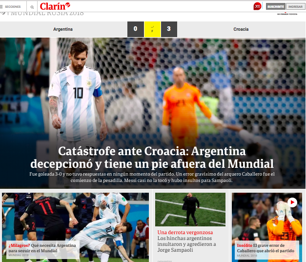“Catástrofe ante Croacia: Argentina decepcionó y tiene un pie fuera del Mundial”, publicó Clarín, uno de los medios más populares en Argentina, que destacó el error de Caballero, el hecho de que Messi casi no tocó el balón y los insultos de la afición argentina hacia el técnico Jorge Sampaoli.