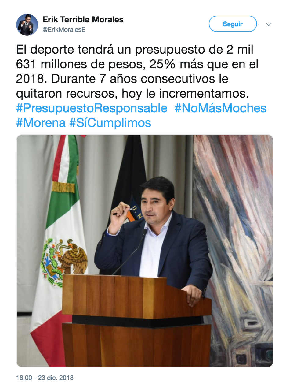 Érick “Terrible” Morales, ex boxeador y ahora diputado federal del distrito 7 de Baja California, se lanzó al ruedo con un mensaje a través de su cuenta de Twitter en la que aseguró que el presupuesto para el deporte incrementó en un 25 por ciento, así que de acuerdo con sus cuentas, se contará con dos mil 631 millones de pesos (segunda cifra). “Durante siete años consecutivos le quitaron recursos, hoy le incrementamos”. Poco después, borró el mensaje de su cuenta.