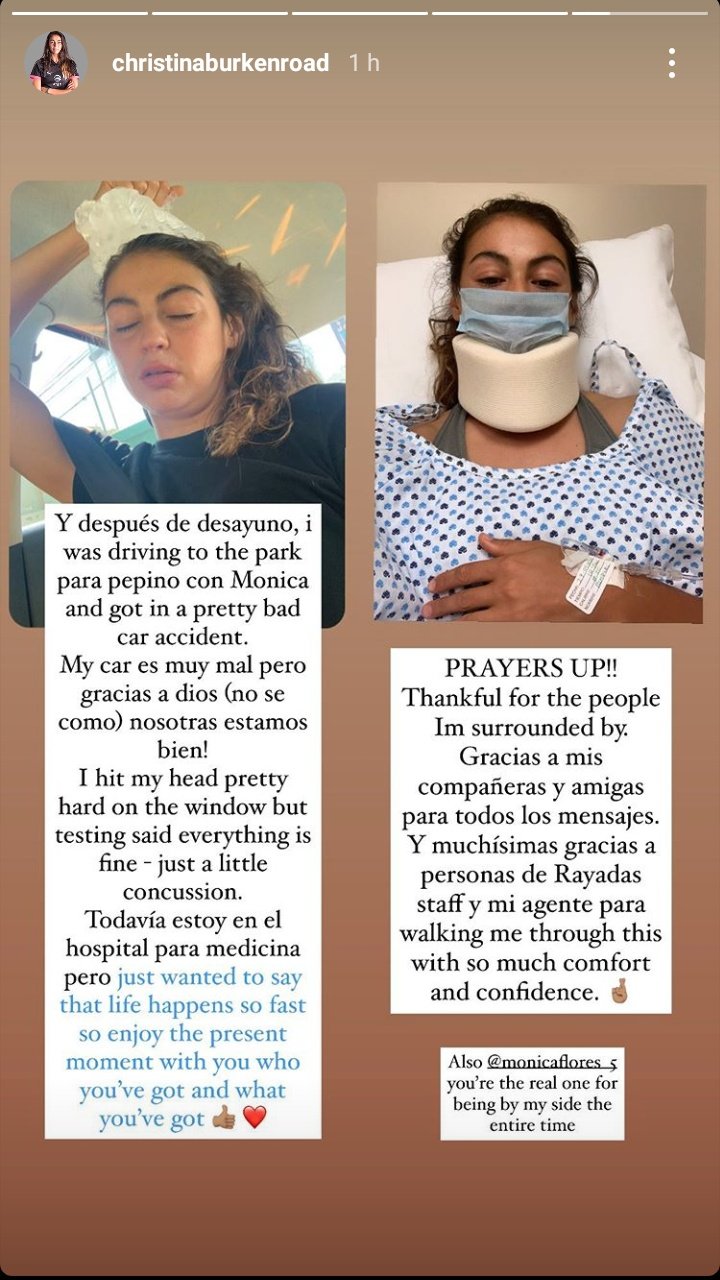 En septiembre del 2020, ‘Burky’ sufrió un accidente automovilístico; “Después del desayuno iba manejando y tuvimos un fuerte accidente automovilístico. Mi carro está muy mal, pero gracias a Dios nosotras estamos bien”, escribió en aquel entonces. Afortunadamente pudo volver a las canchas sin ningún problema.