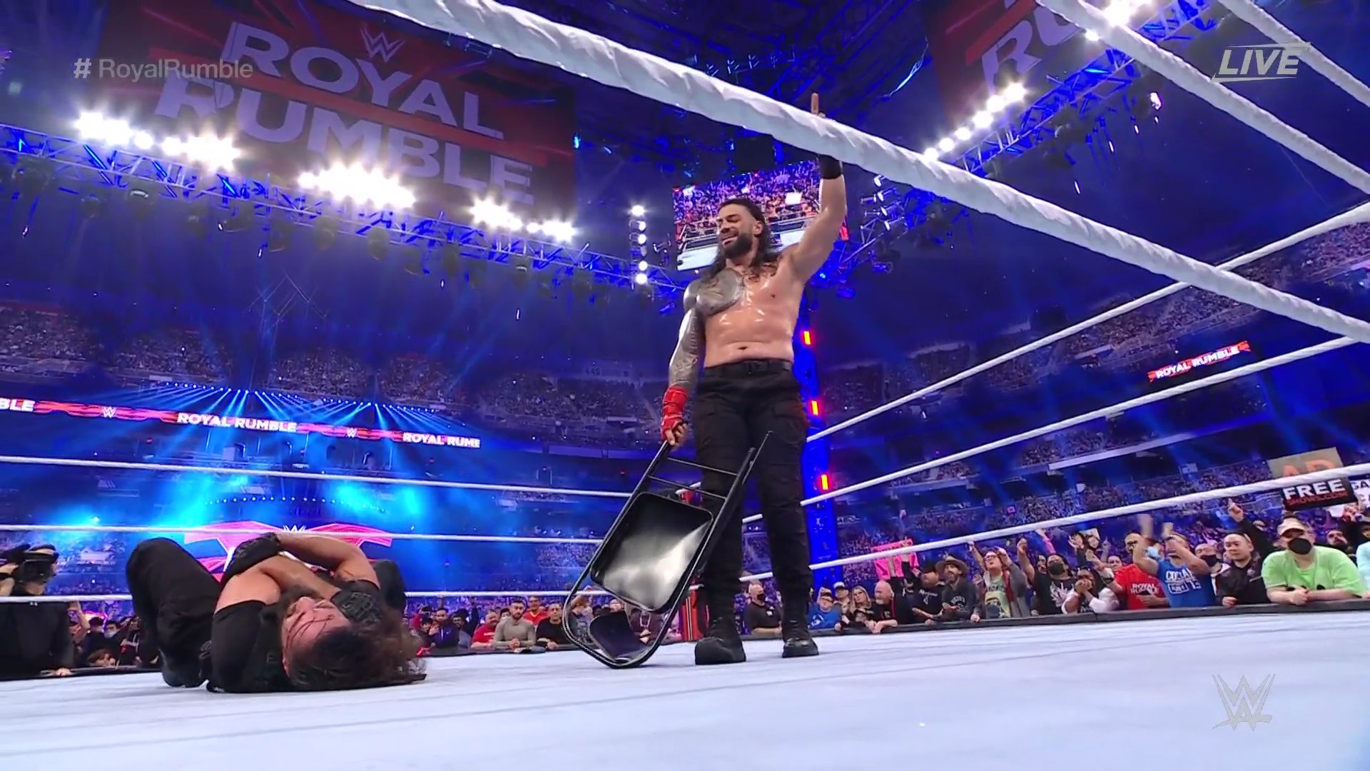 Después de la traición de Paul Heyman, Brock Lesnar fue el último participante del Royal Rumble y a su entrada fue eliminando a uno por uno, incluyendo Bad Bunny. Al final se quedó con Drew McIntyre y sin problemas con un F5, su movimiento personal, logró sacar al escocés.