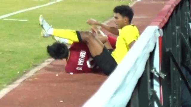 Azam cubría el balón cerca de la línea de meta en la banda izquierda, un delantero de Vietnam lo chocó un poquitín fuerte y lo mandó al suelo, junto al delantero. Ya en el suelo y fuera del campo, el defensor pateó a su rival… y tras esta jugada, Ryuji Sato tomó una polémica, pero acertada decisión.
