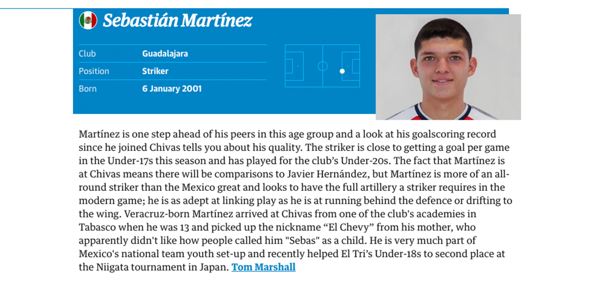 Sebastián Martínez tuvo una participación destacada en la categoría Sub-17 de Chivas. Tanto que ya juega con la Sub-20 y pronto podría tener una oportunidad en el primer equipo de José Saturnino Cardozo. Y en la lista de The Guardian hay una pequeña reseña del jugador, elaborada por el periodista Tom Marshall de ESPN.