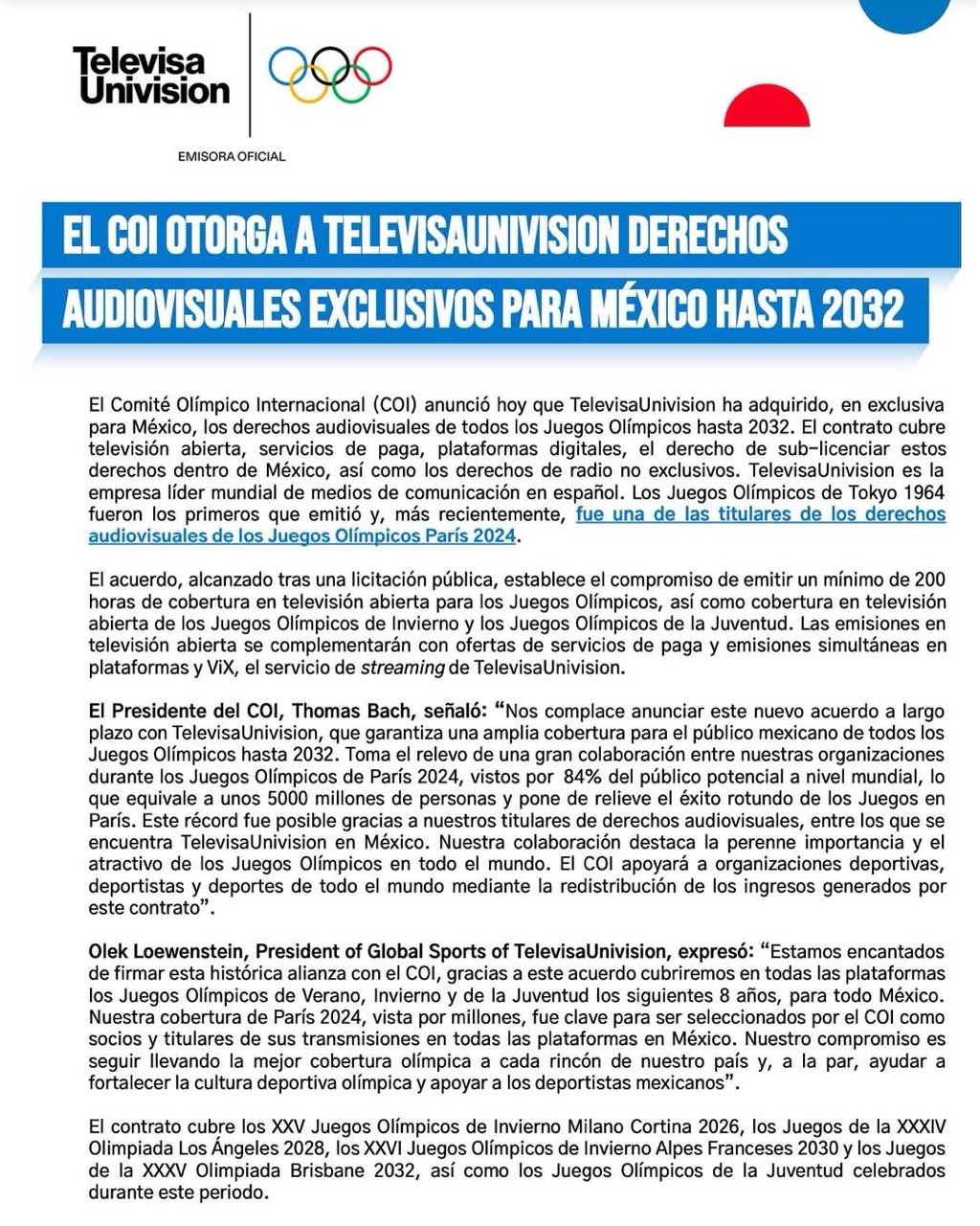 Televisa tendrá los derechos de los Juegos Olímpicos hasta 2032, en exclusiva, lo cual fue anunciado ya formalmente por el Comité Olímpico Internacional. Hablamos tanto de Los Ángeles 2028 y de Brisbane 2032, así como de otros eventos en ese lapso.