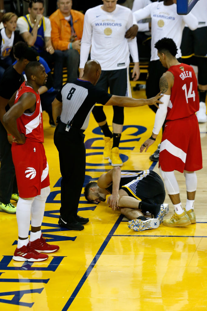 El tercer periodo había sido una fiesta para los Warriors, pues se habían adueñado de la ventaja 80-83 con 2:22 minutos en el reloj, cuando Klay Thompson cayó con todo el peso sobre la rodilla derecha tras una falta personal de Danny Green. Esto llevó a “Splash” al túnel para revisión médica y fue entonces cuando se vino el ánimo abajo, pues las lesiones castigaron a Golden State a lo largo de esta serie.
