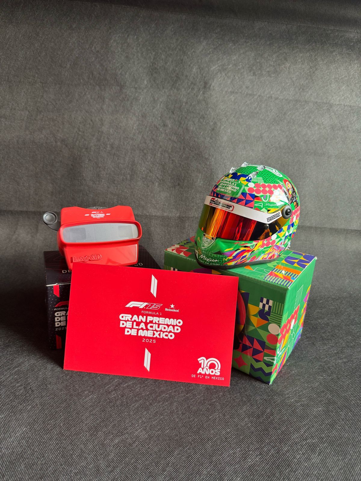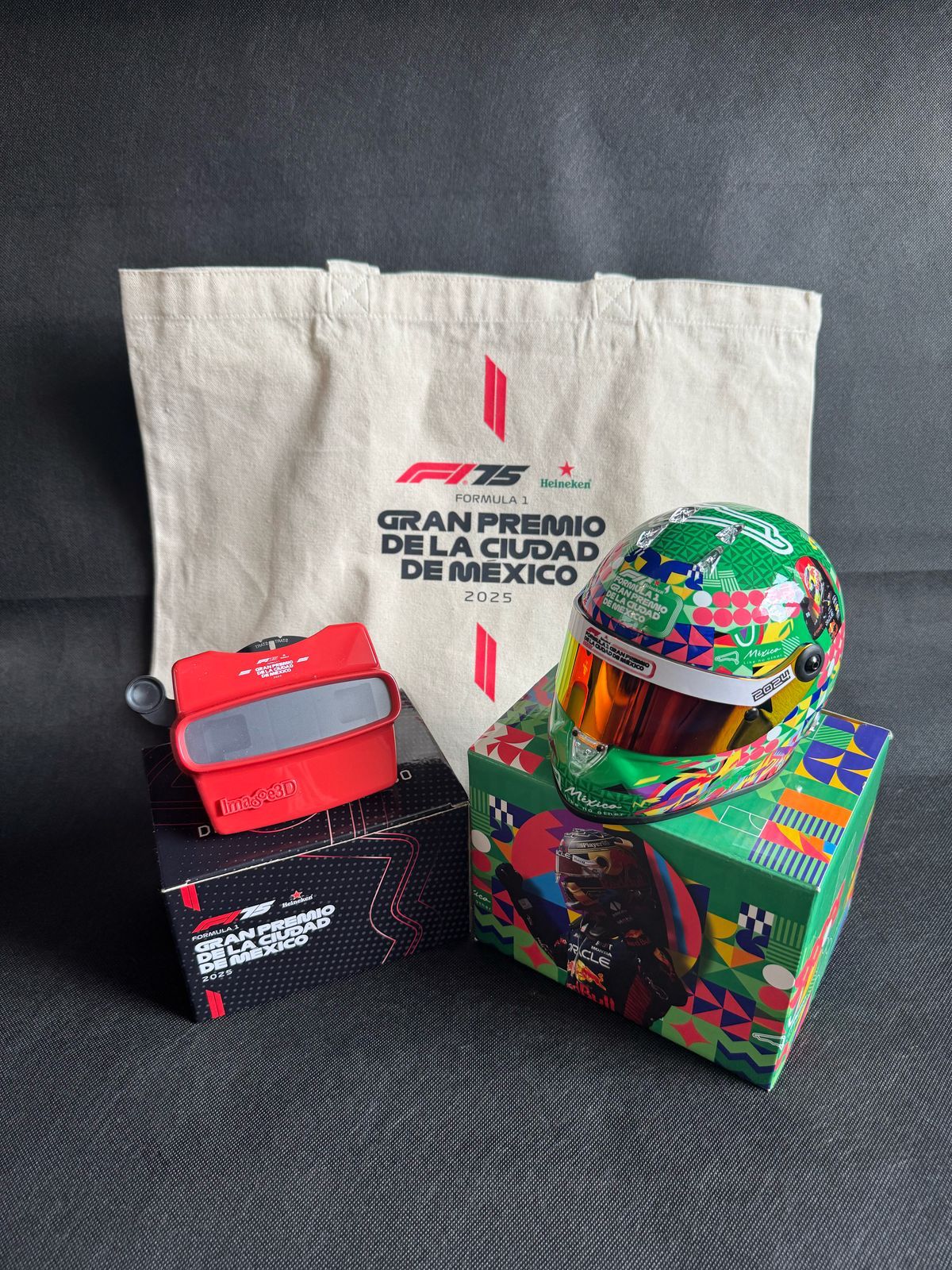 El kit que te regala el Gran Premio de México y Desde el Paddock por Sopitas contiene un mini casco conmemorativo del GP, además de un viewmaster de Fórmula 1, con motivo de los 10 años del regreso de México al calendario, así como su respectiva bolsa con la identidad del 75 aniversario de Fórmula 1 y el GP de México.