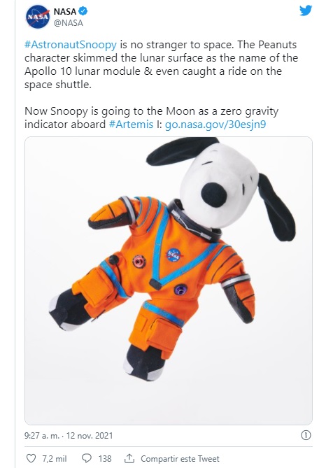 Para el vuelo de la misión ‘Artemis I’, ‘Snoopy’ estará equipado con un traje de vuelo naranja personalizado completo con guantes, botas y un parche de la NASA. Cabe señalar que el peluche de ‘Snoopy’ fue seleccionado por su peso ligero.