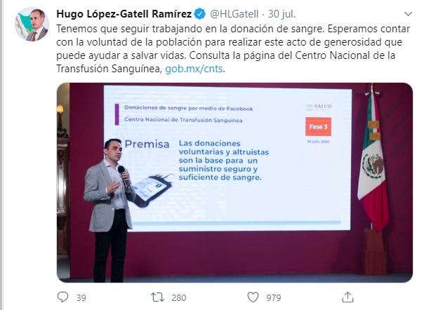 Durante la conferencia vespertina en la que el Dr. Hugo López-Gatell actualiza las estadísticas de COVID-19 en la República Mexicana, Jorge Trejo, titular del Centro de Transfusión Sanguínea, explicó que en los próximos días la función de Facebook estará disponible para todos los usuarios de la red social, puntualizando que lo ideal sería que los donadores de sangre, no solo fueran de una ocasión, sino de “ocasiones repetidas”.