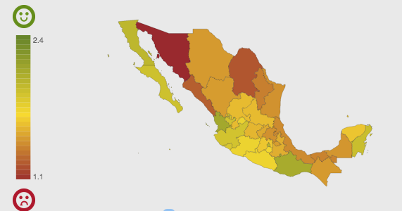 El estudio llamado Estado de ánimo de los tuiteros de los Estados Unidos Mexicanos indica que, según sus primeros resultados, Sonora y Coahuila fueron los lugares dónde se encontraron a los tuiteros más tristes y en Nayarit y Quintana Roo a los más felices.