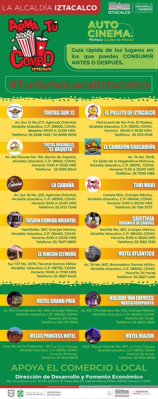 El pasado 29 de julio y para promover el autocinema Mixhuca que está ubicado en su demarcación, la alcaldía Iztacalco difundió una guía con lugares donde la gente podría comprar comida para antes o después de ver una peli en dicho lugar. Una iniciativa que nació con la finalidad de ayudar a los negocios de dicha alcaldía y además, de invitar a la gente a distraerse un poco y de manera segura.
