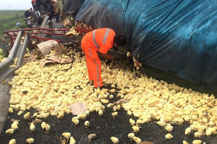 Un trailer que transportaba más de 10,000 pollitos se volcó en la provincia china de Shandong, el conductor perdió el control y miles de aves amarillas comenzaron a salir por los costados del trailer.