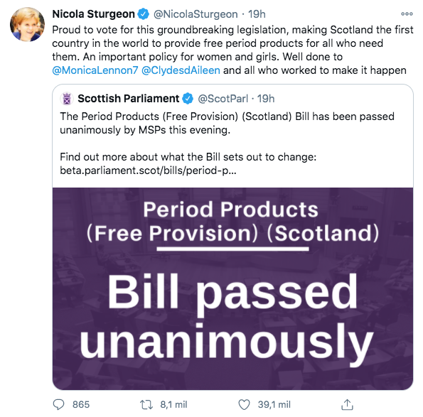 El proyecto de ley de Productos de Periodo de suministro gratuito en Escocia, consiste en que las autoridades locales en instituciones públicas, están obligadas (respaldados por la ley) a suministrar productos menstruales a toda persona que los necesite, y estos, como su nombre lo indica, deberán ser gratis para quien los requiera.