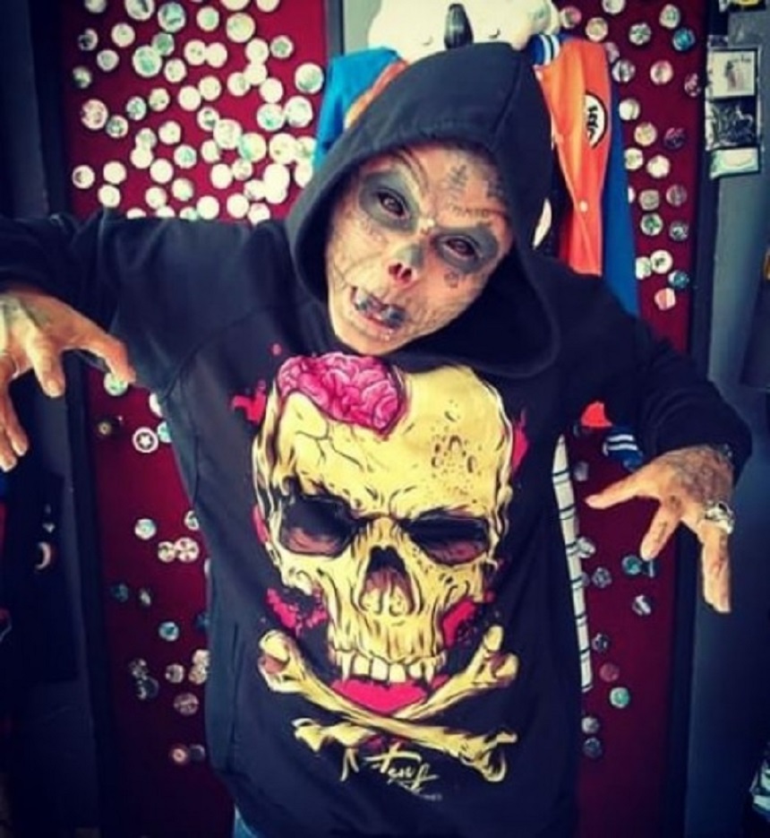 Con 22 años de existir en este mundo, el joven decidió que ya no necesitaba de partes innecesarias de su cuerpo como la nariz y los ojos, así que se deshizo de ellos para entrar más en su personaje. Sus redes sociales están llenas de fotos donde aparece presumiendo su escalofriante apariencia, que no sólo incluye lo que acabamos de mencionar, ya que también está tatuado en casi todos los rincones de su ser.