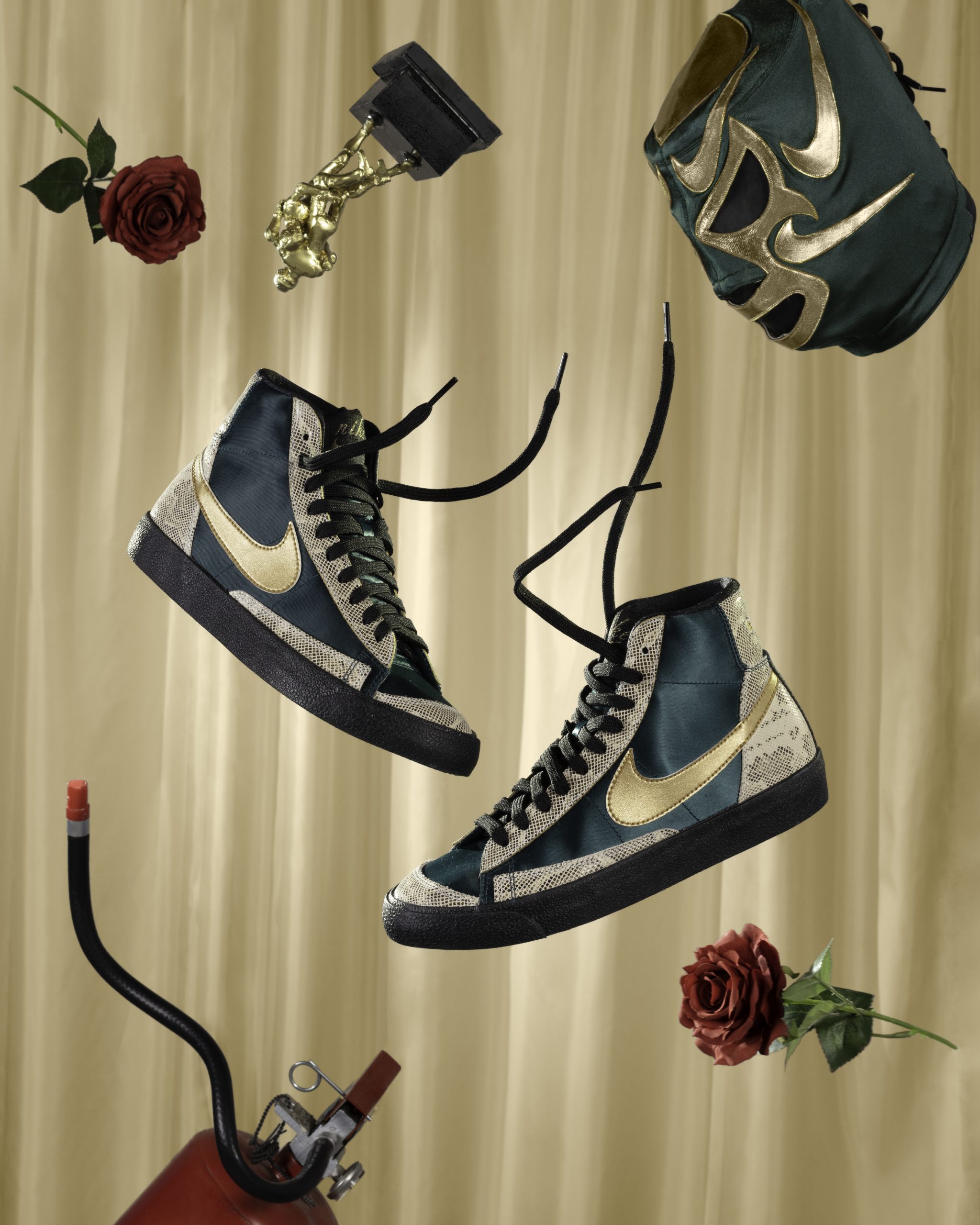 Si de plano eres fanático de hueso colorado de la Lucha Libre y al mismo tiempo de lo exótico, se te advierte que el Blazer Mid te encantará. Este modelo en color verde con dorado representa el profundo amor por este deporte ligado a nuestras raíces mexicanas. Otras características que resaltan en este diseño son sus agujetas que asemejan las máscaras y elementos que hacen referencia a materiales y colores de los trajes de los luchadores.