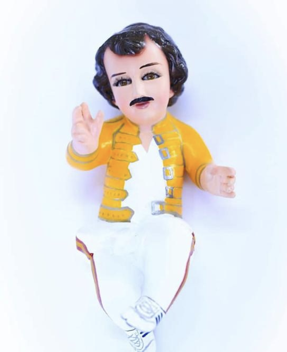 Las figuras que están vendiendo del Niño Dios no tiene el clásico calzón blanco y pecho descubierto como es representado comúnmente. Estas figuras tienen mucha más ropa encima, pero ropa que caracteriza a personajes de ficción y de la cultura popular. Entre el catálogo que se armaron, puedes encontrar al Niño Dios Gokú, Joker, Freddy Mercury y Leono entre otros personajes.